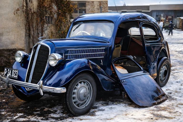 Dramatický pohled na historickou havárii: Kolorovaný snímek vozu Škoda Popular ze 30. let v HDR kvalitě Restaurovaný a barevně věrný snímek zachycující následky vážné dopravní nehody tmavomodrého automobilu na zasněžené ulici. Fotografie vyniká vysokým detailem a dynamickým rozsahem.