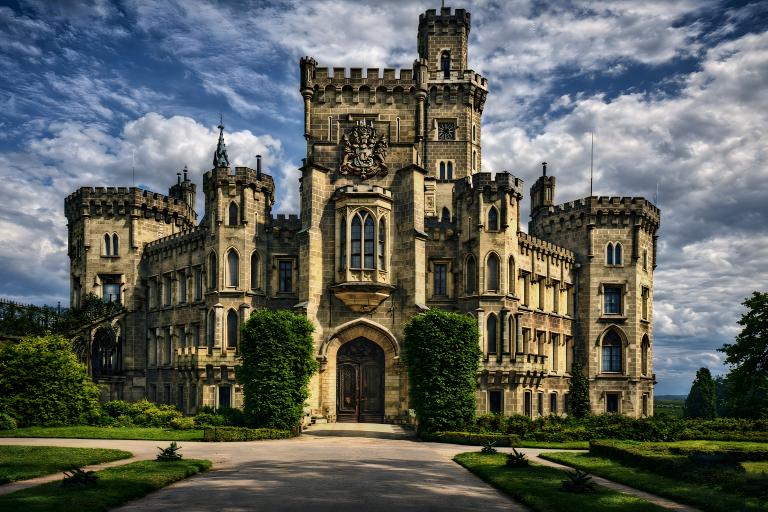 HDR fotografie zámku Hluboká nad Vltavou s výraznou neogotickou architekturou, detailní kresbou kamene a dramatickou oblohou.