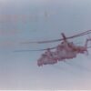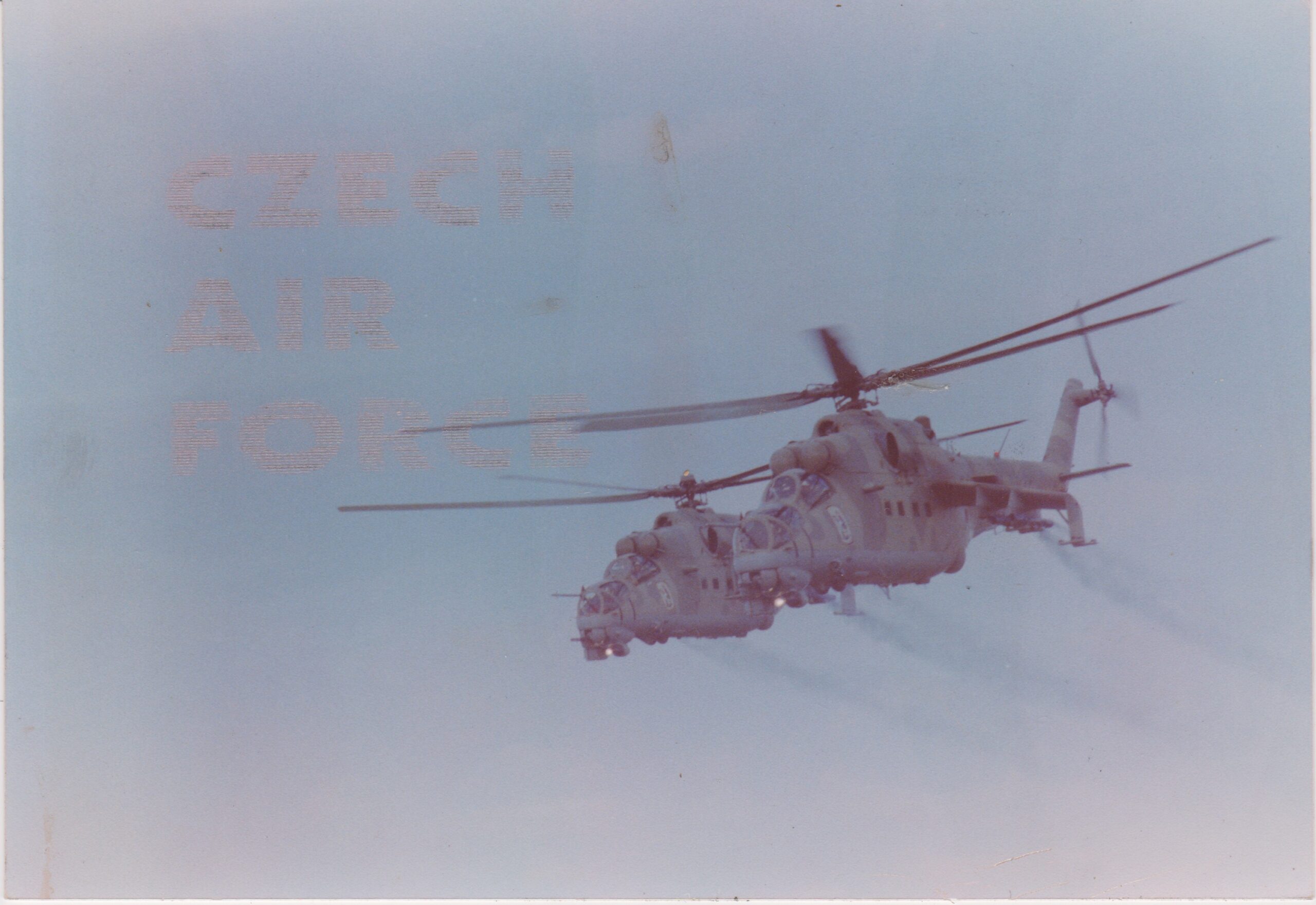 Analogová fotografie restaurovaná umělou inteligencí a grafickými programy– dva vrtulníky Mi-24 české armády v akci. Tyto ikonické bitevní vrtulníky sloužily k podpoře pozemních jednotek, průzkumu a přepravě vojáků, symbolizují vojenskou techniku Československa 80. let.
