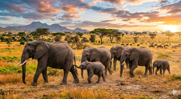 Rodina afrických slonů kráčí savanou při západu slunce v širokém panoramatickém záběru.