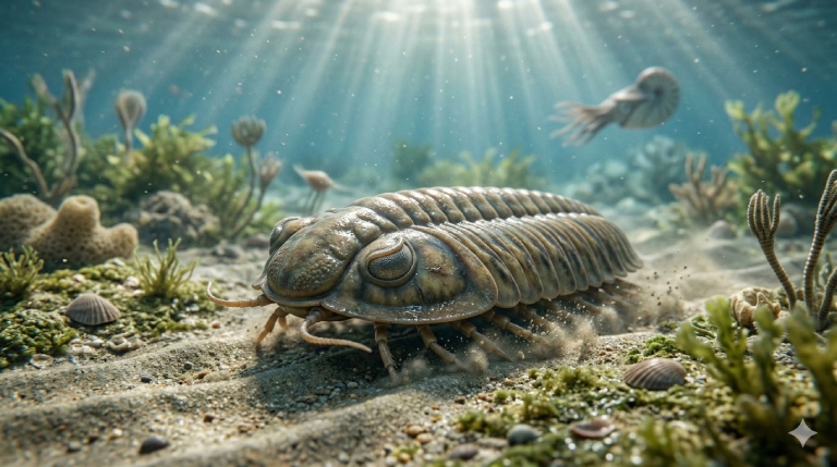 Obrázek znázorňuje blízký detail v jeho přirozeném prostředí na dně mělkého místa oceánu.Trilobiti žili v paleozoiku – poprvé se objevili v raném kambriu a vymřeli na konci permu.