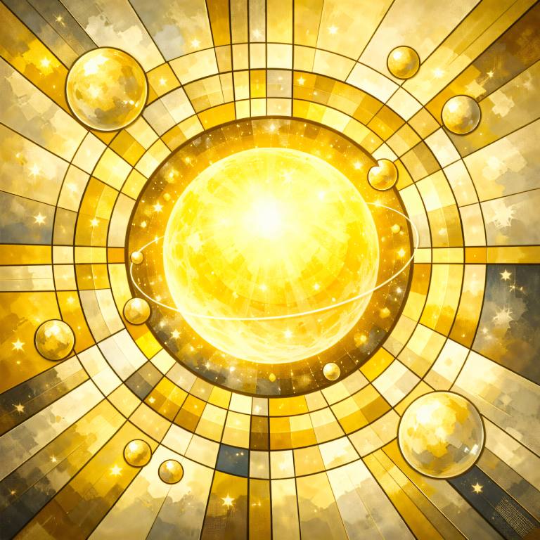 Autorský geometrický obraz planety Venuše v zářivých odstínech zlata, bílé a teplé oranžové. Čistá kompozice bez měsíců a temný kruh kolem planety zdůrazňují její samotný, výrazný a elegantní charakter.