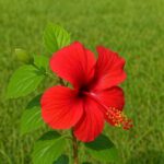 Červený ibišek na zeleném pozadí – výrazný tropický květ sytě červeného ibišku se zelenými listy, přírodní světlo, vertikální kompozice vhodná jako tapeta na telefon nebo menší plakát.
