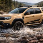 Fotorealistická off-road scéna zachycuje Dacii Duster v barvě Sandstone ve výbavě Extreme při brodění mělkého horského potoka. Auto jede šikmo přes proud po kamenitém dně, kolem pneumatik se zvedá voda a pěna, zatímco v pozadí je les a kopcovitá krajina. Kompozice zdůrazňuje robustní stavbu SUV, terénní pneumatiky, zvýšený podvozek a schopnosti v přírodě mimo asfalt, ideální pro outdoor a automobilovou tematiku