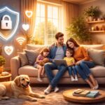 Širokoúhlá 3D ilustrace (16:9) znázorňuje bezpečí domova jako spojení fyzického komfortu a pocitu ochrany. V prosluněném obývacím pokoji sedí rodina na pohodlné pohovce, děti jsou v klidu zabavené a u nohou odpočívá pes, což vytváří atmosféru stability a důvěry. Do prostoru jsou jemně vložené světelné bezpečnostní ikony – štít se zámkem, kamera, Wi-Fi a symboly péče – které naznačují ochranu domácnosti, chytré zabezpečení a klid mysli. Teplé světlo, svíčky, rostliny a útulné doplňky podporují dojem „tady jsem v bezpečí“ a vizuálně propojují téma domova, ochrany a pohody.