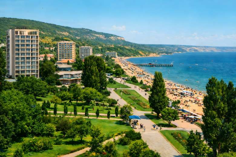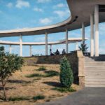Pokročile remasterovaná a kolorovaná historická fotografie zachycující modernistickou architekturu z bulharského poloostrova Neseber. Dominantou scény je elegantní betonová konstrukce s kruhovou linií a štíhlými sloupy, která vytváří výrazný architektonický rytmus. Digitální rekonstrukce odstranila rušivé prvky, sjednotila kompozici a obnovila detaily materiálů i vegetace. HDR zpracování zvýrazňuje plastiku oblohy, texturu kamene a betonu i kontrast mezi suchým terénem a čistými liniemi stavby. Výsledkem je prostorově působivý obraz kombinující historický motiv s moderní fotorealistickou estetikou.