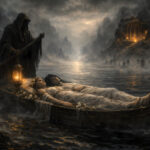 Obraz „CESTA PŘES ŘEKU STYX“ zobrazuje mytologickou cestu přes posvátnou řeku smrti v temně snové fantasy atmosféře. Na starobylé lodi zahalený převozník Charón převáží dvě nehybné postavy připomínající duše nebo zesnulé, zatímco hladinu obklopuje chladná mlha, skalnaté břehy a vzdálené ruiny osvětlené teplým světlem lucerny. Kompozice spojuje klid, smutek i tajemství posmrtného přechodu a vytváří silně symbolický motiv inspirovaný antickou mytologií, smrtí, tichem a cestou do podsvětí.