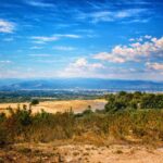 Slunné panorama španělské krajiny s širokou oblohou, vzdálenými horami a atmosférou letní dovolené 90. let.