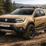 Dynamická automobilová scéna zachycuje Dacii Duster v barvě Sandstone ve výbavě Extreme ze zadního tříčtvrtečního úhlu, jak v terénu projíždí zatáčkou po kamenité lesní cestě. Za vozem se zvedá oblak prachu, drobné kamínky a lehké bahno odletují od pneumatik, což zvýrazňuje trakci, robustní podvozek a outdoorový charakter SUV. Lesní kulisa a kopcovitý horizont dodávají pocit dobrodružství a útěku mimo asfalt, vhodné pro off-road prezentaci, marketing 4×4 a prémiový automobilový vizuál