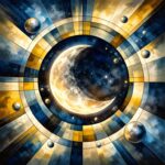 Stylizovaný geometrický obraz Měsíce zasazený do abstraktní kompozice kruhů, oblouků a pravoúhlých segmentů. Dominantním motivem je zářící srpek Měsíce obklopený rytmickou sítí barevných tvarů v modrých, zlatých, bílých a šedých odstínech, které evokují noční oblohu, vesmír a kosmickou rovnováhu. Dílo působí elegantně, moderně a současně klidně, přičemž spojuje dekorativní geometrii s motivem nebeského tělesa. Čtvercový formát 1:1 je vhodný pro digitální prezentaci i dekorativní využití.