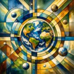 Stylizovaný geometrický obraz planety Země zasazený do abstraktní kompozice kruhů, oblouků a pravoúhlých segmentů. Střed motivu tvoří výrazně zpracovaná Země s kontinenty a oceány, kolem níž se rozvíjí rytmická síť barevných tvarů v modrých, zelených, zlatých a přírodních tónech. Dílo působí moderně, harmonicky a současně evokuje vesmír, rovnováhu, propojení přírody a univerzální řád. Čtvercový formát 1:1 je vhodný pro digitální prezentaci i dekorativní využití.
