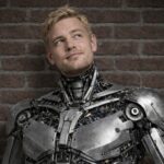 Futuristický portrét zachycuje blond muže s přirozeným výrazem a lehkým úsměvem, kontrastující s komplexní kybernetickou konstrukcí krku, ramen a hrudníku. Detailně propracované kovové pláty, kabeláž a technické komponenty působí realisticky a vytvářejí vizuální příběh o spojení člověka a stroje. Cihlové pozadí dodává scéně industriální charakter a podtrhuje „grounded“ sci-fi estetiku, zatímco HDR Remaster zvýrazňuje textury kovu i jemné tóny pleti pro moderní, filmový look vhodný pro technologická témata, AI, robotiku nebo transhumanismus.