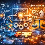 Širokoúhlá (16:9) digitální ilustrace znázorňuje logické myšlení jako propojený systém kroků a nástrojů. Vlevo je silueta hlavy s rozsvíceným mozkem a prvky analýzy (graf, lupa, vzorec), které přecházejí do centrálního labyrintu symbolizujícího hledání správné cesty. Z labyrintu vede šipka k žárovce jako metafora „aha“ momentu. Pravá část kompozice pokračuje ozubenými koly, čísly, šachovou figurou, kontrolními symboly a vyvažovacími vahami, které reprezentují strukturované rozhodování, dedukci, ověřování a vyhodnocování důkazů. Barevný přechod od chladných modrých tónů k teplým oranžovým podtrhuje přechod od analýzy k řešení.
