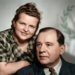 Stylizovaný a pečlivě restaurovaný portrét manželského páru zachyceného v intimní a důstojné póze. Žena se s jemným úsměvem opírá o muže v obleku a kravatě, zatímco měkké světlo, decentní pozadí a náznak vavřínového motivu vytvářejí klidnou, slavnostní a nadčasovou atmosféru. Snímek působí jako kvalitně obnovená historická nebo rodinná fotografie s důrazem na přirozené tóny pleti, detaily tváří a elegantní retro charakter.
