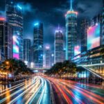 Digitálně stylizovaný noční městský motiv zachycuje širokou moderní třídu obklopenou vysokými skleněnými budovami, zářícími reklamními plochami a palmami po stranách komunikace. Dlouhá závěrka vytváří výrazné světelné stopy projíždějících vozidel, které dodávají scéně rychlost, energii a futuristickou atmosféru. Mokrá vozovka odráží pestré modré, červené, oranžové a růžové tóny, takže celek působí jako živý HDR remaster městské noci. Obraz je vhodný jako moderní dekorace i jako vizuál pro témata technologie, urbanismu, dopravy nebo digitální budoucnosti. Fotografie neobsahuje konkrétní nápisy či loga firem ani existujicí město a je tak bezproblémově neutrální ilustrací.