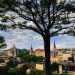 Kolorovaná historická fotografie zachycuje město Plzeň z vyvýšeného místa poblíž nádraží v období první republiky. Kompozice je rámována mohutnými stromy v popředí, které vytvářejí přirozený rám pro panorama města. V pozadí vynikají věže kostelů, městské budovy i tehdejší moderní architektura, která odráží dynamický rozvoj meziválečného Československa. HDR úprava zvýrazňuje detaily fasád, strukturu oblohy i zeleň v okolí, čímž snímek získává plastický a živý charakter při zachování historické atmosféry. Fotografie představuje cenný vizuální dokument urbanistického vývoje Plzně a dobového městského prostředí.