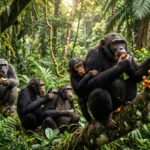 Přírodní scéna zachycující několik šimpanzů v bujné tropické džungli během krmení. Dospělí jedinci i mláďata sedí na mechem porostlých větvích a drží v tlapách drobné oranžové plody. Hustá vegetace, liány, kapradiny a měkké rozptýlené světlo vytvářejí atmosféru vlhkého deštného pralesa a zdůrazňují rodinné i sociální chování této skupiny primátů.