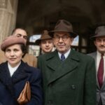 Původně černobílá fotografie zachycuje pětici osob při společném setkání před vstupem do budovy. Vlevo v popředí stojí žena v tmavém kabátu a baretu, uprostřed muž s kulatými brýlemi a kloboukem, vpravo muž ve světlém saku. V pozadí jsou další dva muži, jeden částečně zakrytý. Oděvní styl a celková kompozice odpovídají přibližně druhé polovině 40. let až začátku 50. let 20. století.
