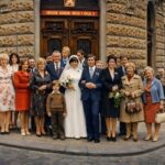 Restaurovaný a kolorovaný archivní svatební snímek z Československa: nevěsta se závojem a kyticí a ženich v obleku stojí uprostřed skupiny rodiny a hostů před budovou s nápisem „Obvodní národní výbor v Praze 3“. Díky COREX™ obnově, živým sytým barvám a HDR kontrastu vyniká dobová móda, pleťové tóny, textura kamenné fasády i detaily ulice, přičemž původní bílé okraje jsou nahrazeny plynule navazujícím pokračováním scény