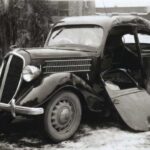 Historická fotografie nabouraného auta cca první polovina 20. století.
